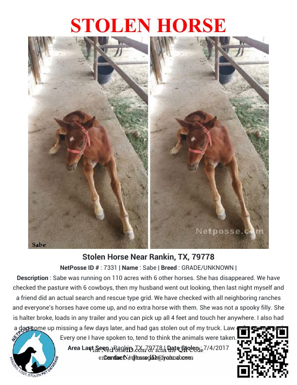 Description: Sabe was running on 110 acres with 6 other horses. She has disappeared. We have checked the pasture with 6 cowboys, then my husband went out looking, then last night myself and a friend did an actual search and rescue type grid. We have checked with all neighboring ranches and everyone's horses have come up, and no extra horse with them. She was not a spooky filly. She is halter broke, loads in any trailer and you can pick up all 4 feet and touch her anywhere. I also had a dog come up missing a few days later, and had gas stolen out of my truck. Law enforcement and Every one I have spoken to, tend to think the animals were taken.