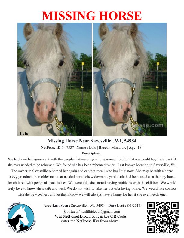 Description: We had a verbal agreement with the people that we originally rehomed Lulu to that we would buy Lulu back if she ever needed to be rehomed. We found she has been rehomed twice. Last known location in Saxesville, Wi. The owner in Saxesville rehomed her again and can not recall who has Lulu now. She may be with a horse savvy grandma or an older man that needed her to chew down his yard. Lulu had been used as a therapy horse for children with personal space issues. We were told she started having problems with the children. We would truly love to know she's safe and well. We do not wish to take her out of a loving home. We would like contact with the new owners and let them know we will always have a home for her if she ever needs one.