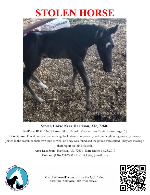 Description: Found our new foal missing, looked over out property and our neighboring property owners joined in the search on their own land as well. no body was found and the police were called. They are making a theft report on this little colt.