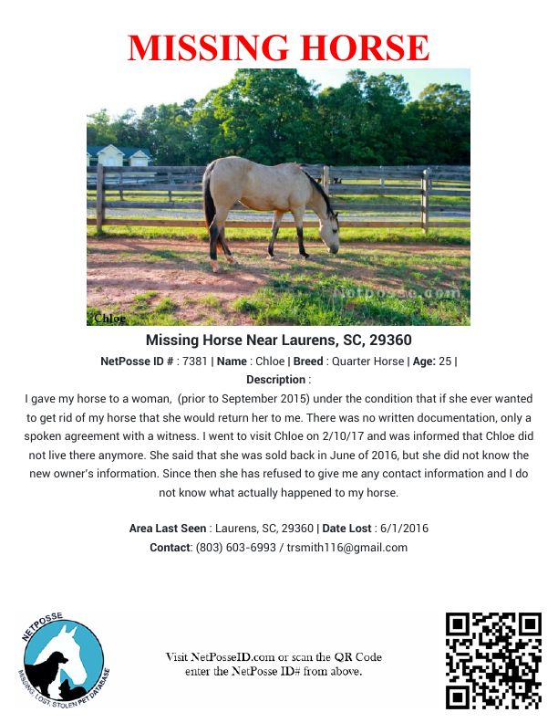 Description: I gave my horse to a woman, (prior to September 2015) under the condition that if she ever wanted to get rid of my horse that she would return her to me. There was no written documentation, only a spoken agreement with a witness. I went to visit Chloe on 2/10/17 and was informed that Chloe did not live there anymore. She said that she was sold back in June of 2016, but she did not know the new owner's information. Since then she has refused to give me any contact information and I do not know what actually happened to my horse.