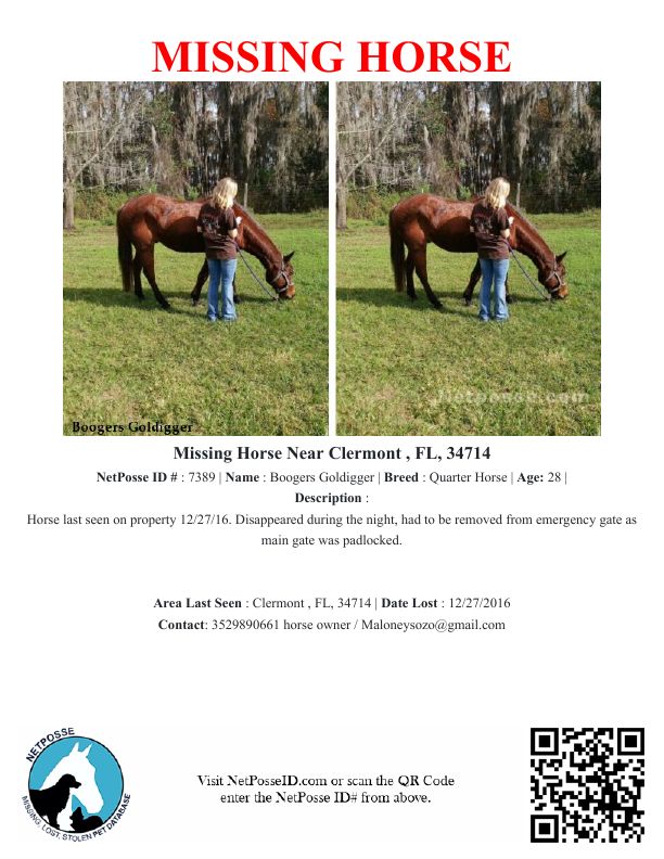 Description: Horse last seen on property 12/27/16. Disappeared during the night, had to be removed from emergency gate as main gate was padlocked.