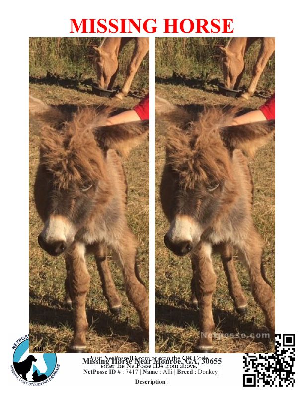 Description: Alli was in our pasture with two horses and on Sunday at 12 noon. Sometimes between that hour and 6 pm she was taken from the pasture. She was bonded with our mare and wouldn't leave her side. Twelve week old donkey was taken from our pasture.