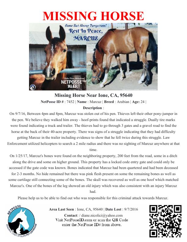 On 1/25/17, Marcuz's bones were found on the neighboring property, 200 feet from the road, some in a ditch along the drive and some on higher ground. This property has a locked code entry gate and could only be accessed if the gate code was known. Bones indicated that Marcuz had been quartered and had been deceased for 2-3 months. No hide remained but there was pink flesh present on some the remaining bones as well as some cartilage still connecting some of the bones. The skull was recovered as well as one hoof which matched Marcuz's. One of the bones of the leg showed an old injury which was also consistent with an injury Marcuz had.