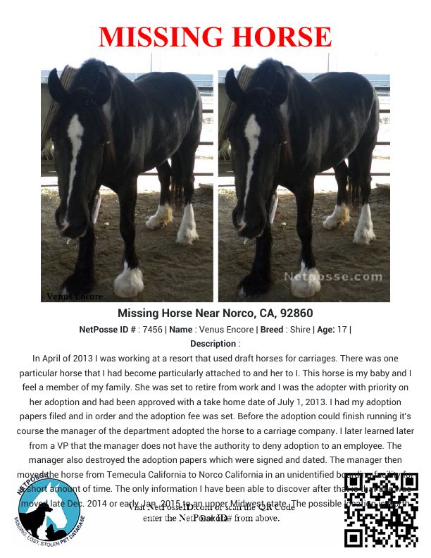 Description: In April of 2013 I was working at a resort that used draft horses for carriages. There was one particular horse that I had become particularly attached to and her to I. This horse is my baby and I feel a member of my family. She was set to retire from work and I was the adopter with priority on her adoption and had been approved with a take home date of July 1, 2013. I had my adoption papers filed and in order and the adoption fee was set. Before the adoption could finish running it's course the manager of the department adopted the horse to a carriage company. I later learned later from a VP that the manager does not have the authority to deny adoption to an employee. The manager also destroyed the adoption papers which were signed and dated. The manager then moved the horse from Temecula California to Norco California in an unidentified boarding facility for a short amount of time. The only information I have been able to discover after that is that she was moved late Dec. 2014 or early Jan. 2015 to an upper Midwest state. The possible location is North Dakota.