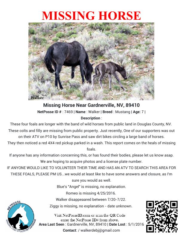 These colts and filly are missing from public property. Just recently, One of our supporters was out on their ATV on P10 by Sunrise Pass and saw dirt bikes circling a large band of horses.