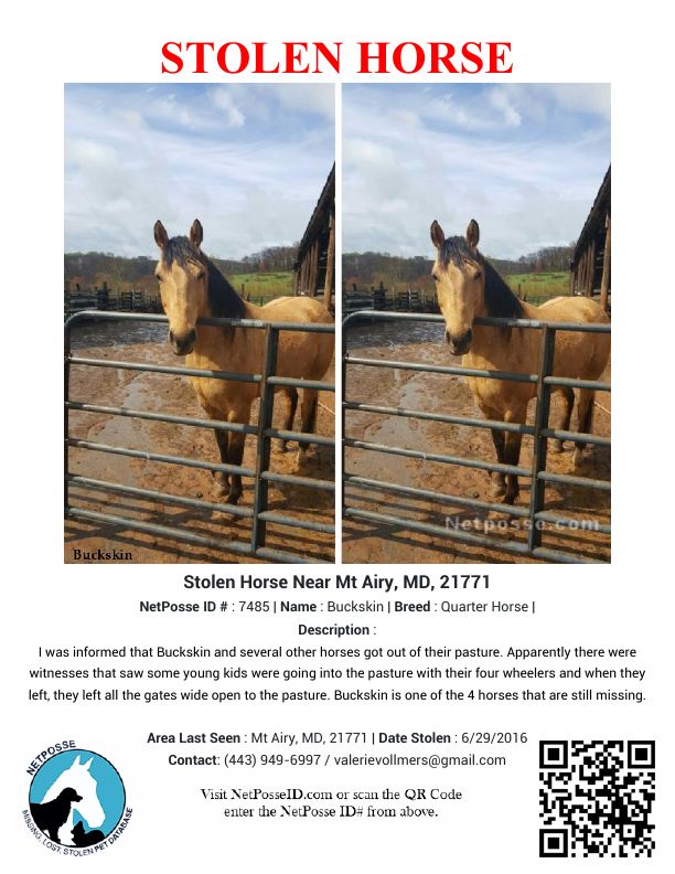 Description: I was informed that Buckskin and several other horses got out of their pasture. Apparently there were witnesses that saw some young kids were going into the pasture with their four wheelers and when they left, they left all the gates wide open to the pasture. Buckskin is one of the 4 horses that are still missing.