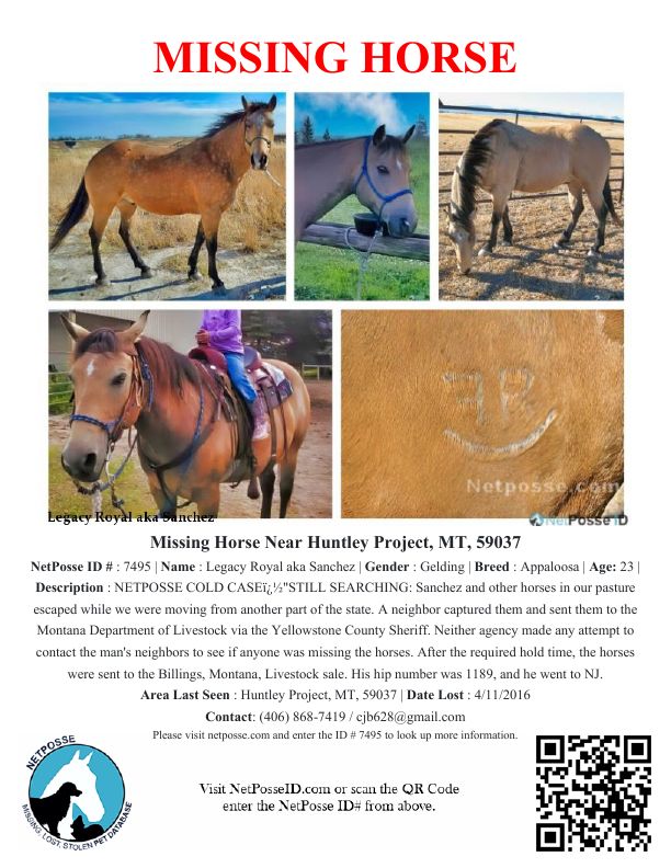 We also lost two other horses, but we are pretty sure it's too late for them; they were sent to slaughter feedlots. Please note the brand on his right shoulder! His hip number at the Billings Sale was 1189 (if that helps?).