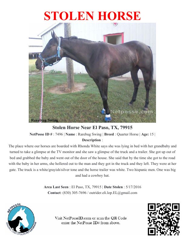 Description: The place where our horses are boarded with Rhonda White says she was lying in bed with her grandbaby and turned to take a glimpse at the TV monitor and she saw a glimpse of the truck and a trailer. She got up out of bed and grabbed the baby and went out of the door of the house. She said that by the time she got to the road with the baby in her arms, she hollered out to the man and they got in the truck and they left. They were at her gate. The truck is a white/grayish/silver tone and the horse trailer was white. Two hispanic men. One was big and had a cowboy hat.