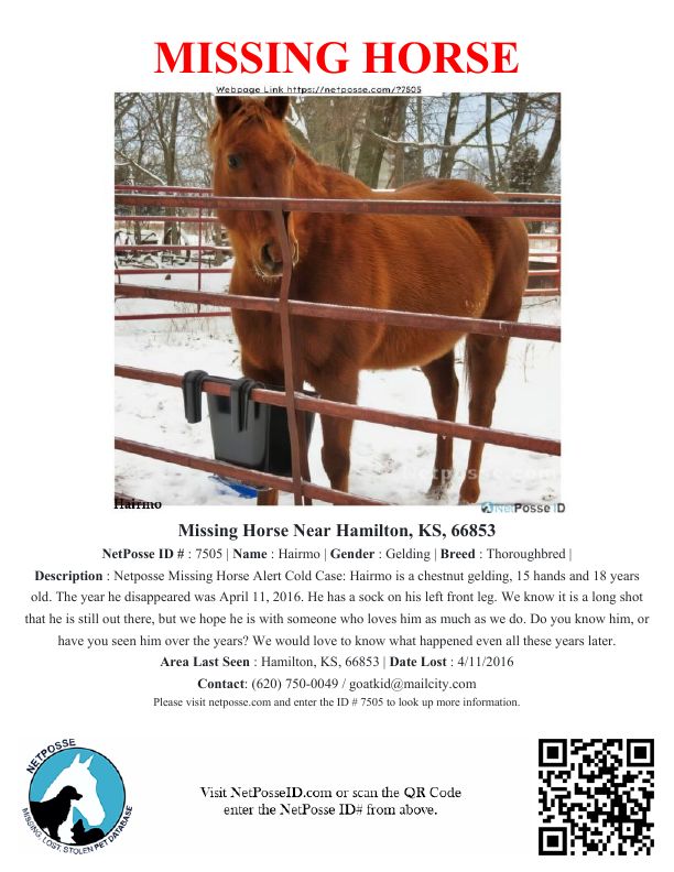 Description: Netposse Missing Horse Alert Cold Case: Hairmo is a chestnut gelding, 15 hands, and 18 years old the year he disappeared, April 11, 2016. He has a sock on his left front leg. We know it is a long shot that he is still out there, but we hope he is with someone who loves him as much as we do. Do you know him, or have you seen him over the years?