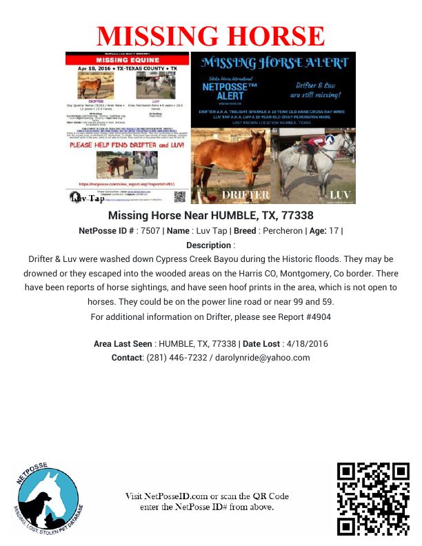 Description: Drifter & Luv were washed down Cypress Creek Bayou during the Historic floods. They may be drowned or they escaped into the wooded areas on the Harris CO, Montgomery, Co border. There have been reports of horse sightings, and have seen hoof prints in the area, which is not open to horses. They could be on the power line road or near 99 and 59.