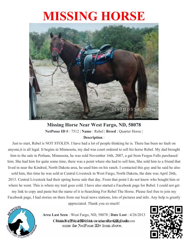 Description: Just to start, Rebel is NOT STOLEN. I have had a lot of people thinking he is. There has been no fault on anyone,it is all legal. It begins in Minnesota, my dad was court ordered to sell his horse Rebel. My dad brought him to the sale in Perham, Minnesota, he was sold November 16th, 2007, a gal from Fergus Falls purchased him. She had him for quite some time, there was a point where she had to sell him, She sold him to a friend that lived in near the Kindred, North Dakota area, he used him on his ranch. I contacted this guy and he said he also sold him, this time he was sold at Central Livestock in West Fargo, North Dakota, the date was April 26th, 2013. Central Livestock had their spring horse sale that day. From that point I do not know who bought him or where he went. This is where my trail goes cold. I have also started a Facebook page for Rebel. I could not get my link to copy and paste but the name of it is-Searching For Rebel The Horse. Please feel free to join my Facebook page, I had stories on there from our local news stations, lots of pictures and info. Any help is greatly appreciated. Thank you so much!