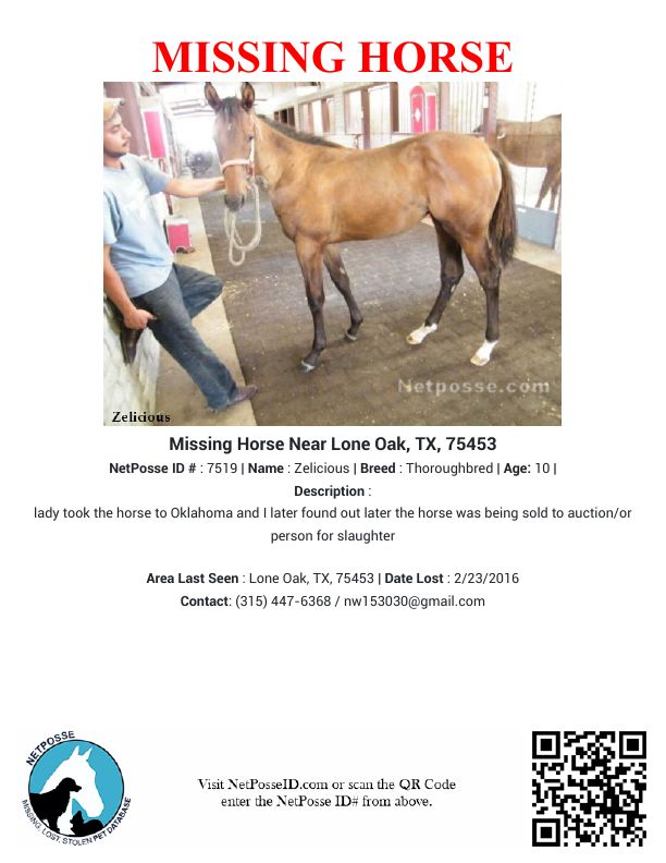 Description: lady took the horse to Oklahoma and I later found out later the horse was being sold to auction/or person for slaughter