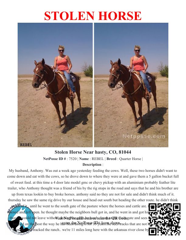 Description: My husband, Anthony. Was out a week ago yesterday feeding the cows. Well, these two horses didn't want to come down and eat with the cows, so he drove down to where they were at and gave them a 5 gallon bucket full of sweet feed. at this time a 4 door late model gmc or chevy pickup with an aluminium probably feather lite trailer, who Anthony thought was a friend of his by the rig stops in the road and says that he and his brother are up from texas lookin to buy broke horses. anthony said no they are not for sale and didn't think much of it. thursday he saw the same rig drive by our house and head out south but heading the other route. he didn't think much of it,, until he went to the south gate of the pasture where the horses and cattle are. the gate had been opened and left open. he thought maybe the neighbors bull got in, and he went in and got him out.. the neighbor though would not leave without closing the gate. he heads down to the main gate and sees that the gate is not latched on the post the way he has been doing it for 35 years..he sees tracks that are not his and went out monday and tracked the ranch.. we're 11 miles long here with the arkansas river close by. anthony was a professional guide and outfitter fro 20 years.. he is positive someone came in thru the south gate, lured the horses in with grain in the trailer and went out thru the main gate. We have contacted all our neighbors and some remember seeing that rig go by.. but no one has a license plate number and the man in the pickup was wearing sunglasses and a big hat. anthony would not be able to pick him out of a lineup