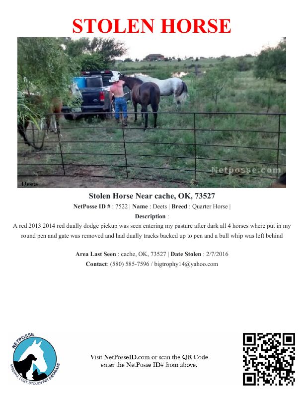 Description: A red 2013 2014 red dually dodge pickup was seen entering my pasture after dark all 4 horses where put in my round pen and gate was removed and had dually tracks backed up to pen and a bull whip was left behind