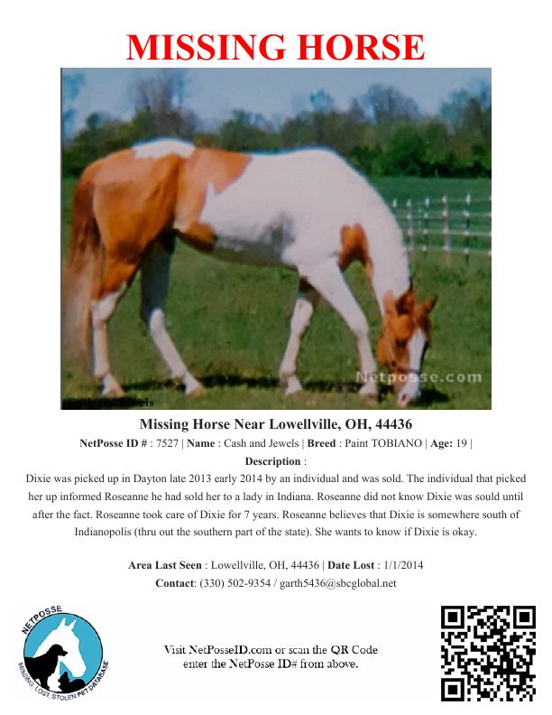 Description: Dixie was picked up in Dayton late 2013 early 2014 by an individual and was sold. The individual that picked her up informed Roseanne he had sold her to a lady in Indiana. Roseanne did not know Dixie was sould until after the fact. Roseanne took care of Dixie for 7 years. Roseanne believes that Dixie is somewhere south of Indianopolis (thru out the southern part of the state). She wants to know if Dixie is okay.