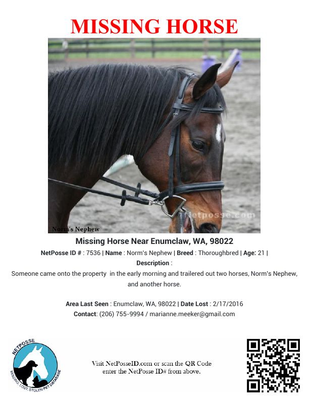 Description: Someone came onto the property in the early morning and trailered out two horses, Norm's Nephew, and another horse.