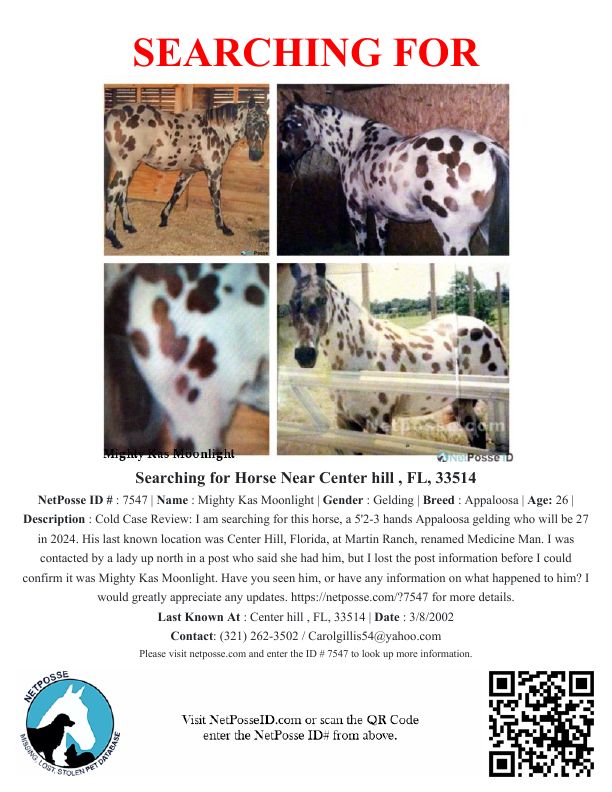 Description: I am searching for this horse, 15'2-3 hands. He was 18 when this report was filed with Stolen Horse International. He would be 27 in 2024. His last known location was Center Hill, Florida, at Martin Ranch, renamed Medicine Man. He is a gelding leopard Appaloosa. A lady somewhere up north contacted me several years ago and said she rescued an app from one of the auction houses. She said her farrier checked her horse against the lad’s picture and said they were the same horse. I tried to contact her again and lost her darn post. She swore it was him. She sent me a picture of the horse, but it had a really heavy coat because he was in a snowy state. And I couldn’t see his markings because he had a distinct marking of a snoopy dog.