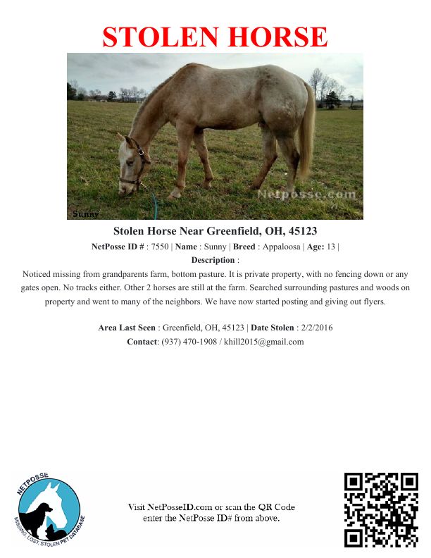 Description: Noticed missing from grandparents farm, bottom pasture. It is private property, with no fencing down or any gates open. No tracks either. Other 2 horses are still at the farm. Searched surrounding pastures and woods on property and went to many of the neighbors. We have now started posting and giving out flyers.