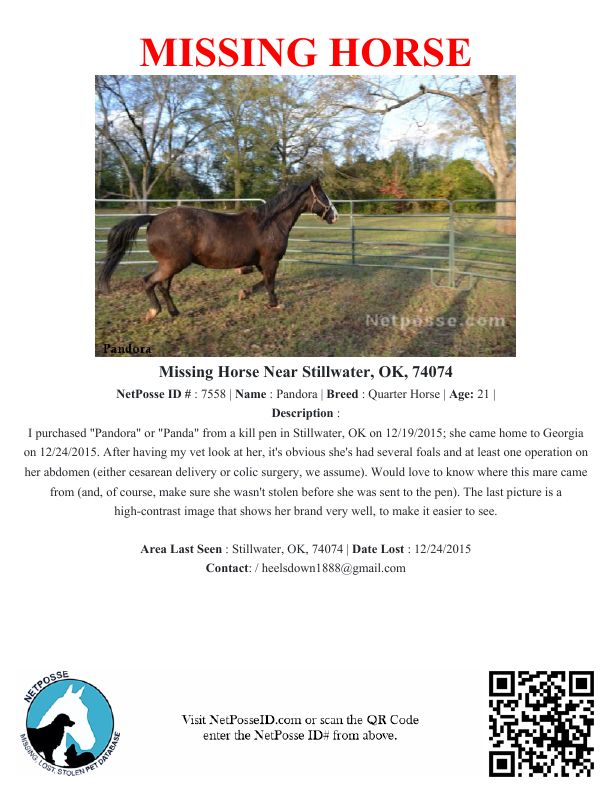 Description: I purchased "Pandora" or "Panda" from a kill pen in Stillwater, OK on 12/19/2015; she came home to Georgia on 12/24/2015. After having my vet look at her, it's obvious she's had several foals and at least one operation on her abdomen (either cesarean delivery or colic surgery, we assume). Would love to know where this mare came from (and, of course, make sure she wasn't stolen before she was sent to the pen). The last picture is a high-contrast image that shows her brand very well, to make it easier to see.