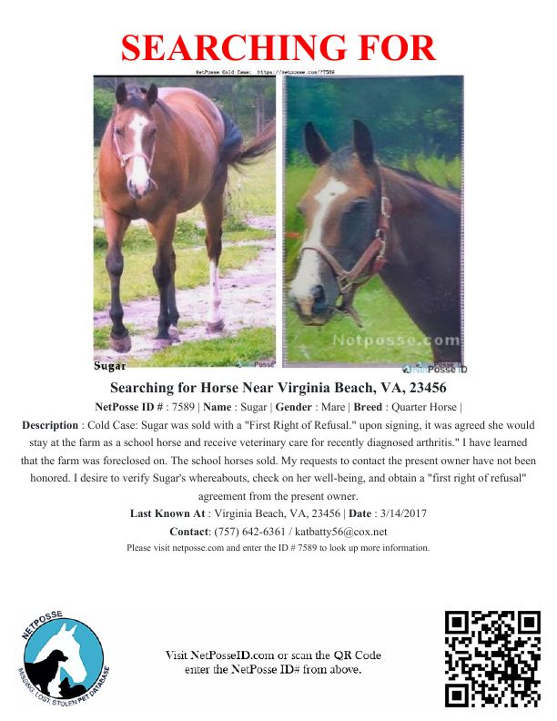 Description: Sugar was sold with a "First Right of Refusal." upon signing, it was agreed she would stay at the farm as a school horse and receive veterinary care for recently diagnosed arthritis." I have learned that the farm was foreclosed on. The school horses sold, I was not notified of the action nor given the chance to excercise the "first right of refusal." My requests to be put in touch with present owner have not been honored. "My desire is to simply verify Sugar's whereabouts, check on her well being and obtain "first right of refusal" agreement from present owner."