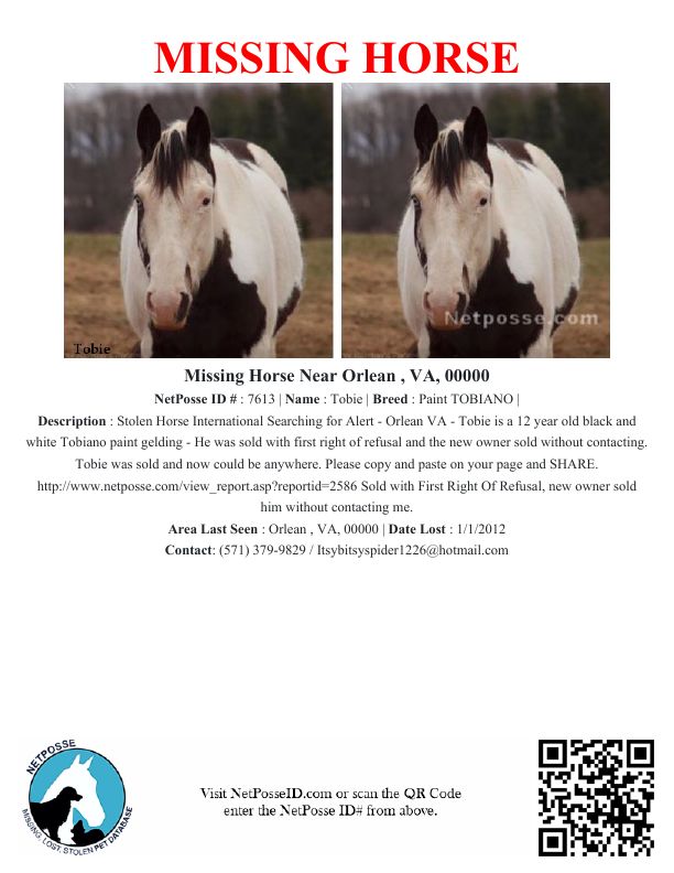 Description: Stolen Horse International Searching for Alert - Orlean VA - Tobie is a 12 year old black and white Tobiano paint gelding - He was sold with first right of refusal and the new owner sold without contacting. Tobie was sold and now could be anywhere. Please copy and paste on your page and SHARE. http://www.netposse.com/view_report.asp?reportid=2586
