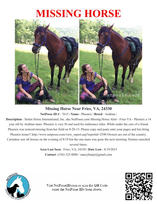 Description: Stolen Horse International, Inc. aka NetPosse.com Missing Horse Alert - Fries VA - Phoenix a 14 year old by Arabian mare. Phoenix is very fit and used for endurance rides. While under the care of a friend Phoenix was noticed missing from her field on 8-20-15. Please copy and paste onto your pages and lets bring Phoenix home!! http://www.netposse.com/view_report.asp?reportid=2590
