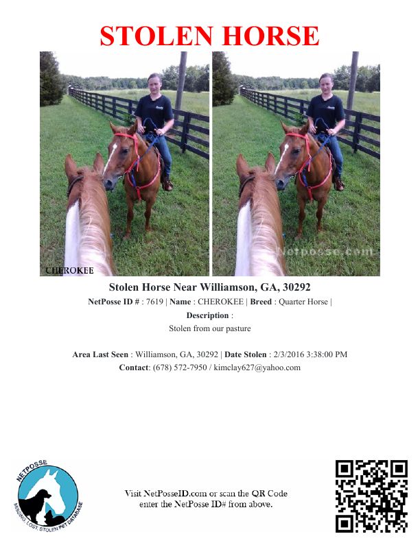 We are still actively searching for Cherokee. His owner has never notified NetPosse that Cherokee has been located, and until we receive confirmation otherwise, Cherokee remains missing and presumed stolen.