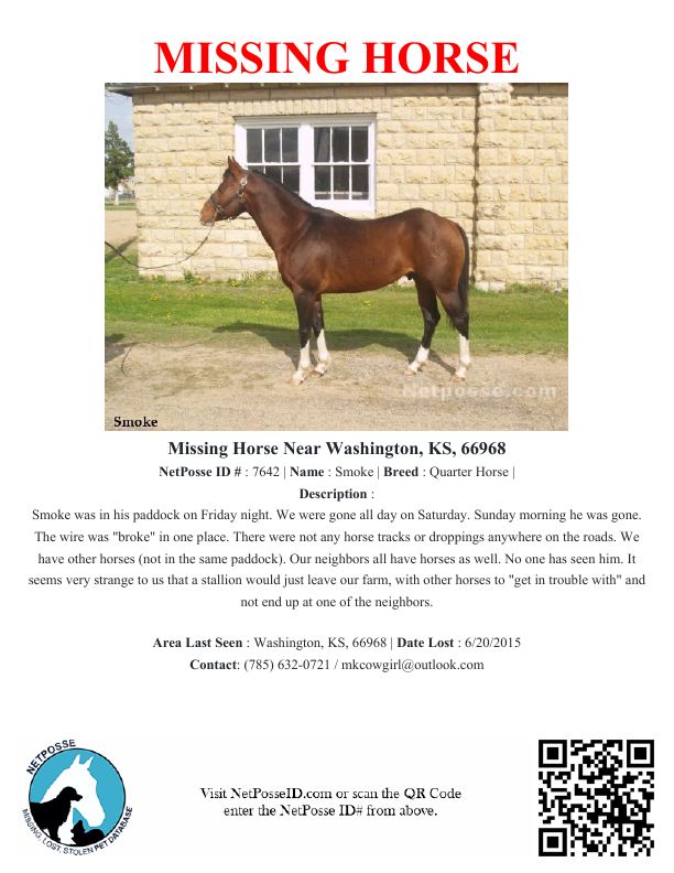 Description: Smoke was in his paddock on Friday night. We were gone all day on Saturday. Sunday morning he was gone. The wire was "broke" in one place. There were not any horse tracks or droppings anywhere on the roads. We have other horses (not in the same paddock). Our neighbors all have horses as well. No one has seen him. It seems very strange to us that a stallion would just leave our farm, with other horses to "get in trouble with" and not end up at one of the neighbors.
