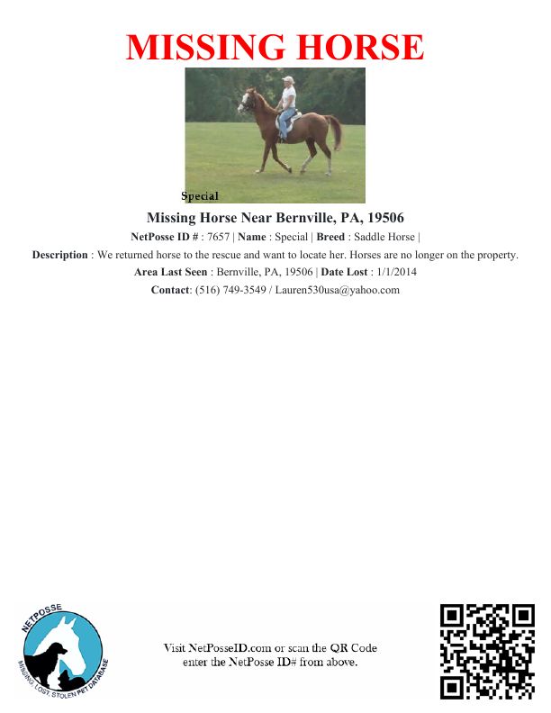 Description: We returned horse to the rescue and want to locate her. Horses are no longer on the property.
