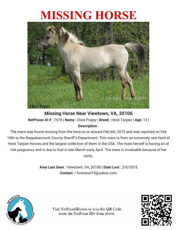 Description: The mare was found missing from the herd on or around Feb 6th, 2015 and was reported on Feb 10th to the Rappahannock County Sheriff's Department. This mare is from an extremely rare herd of Heck Tarpan Horses and the largest collection of them in the USA. The mare herself is having an at risk pregnancy and is due to foal in late March early April. The mare is invaluable because of her rarity.