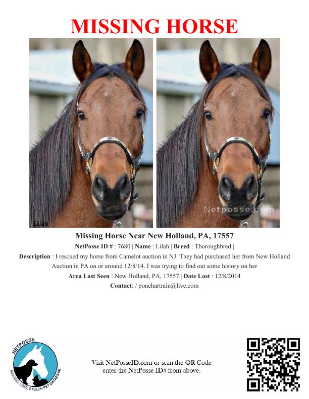 Description: I rescued my horse from Camelot auction in NJ. They had purchased her from New Holland Auction in PA on or around 12/8/14. I was trying to find out some history on her