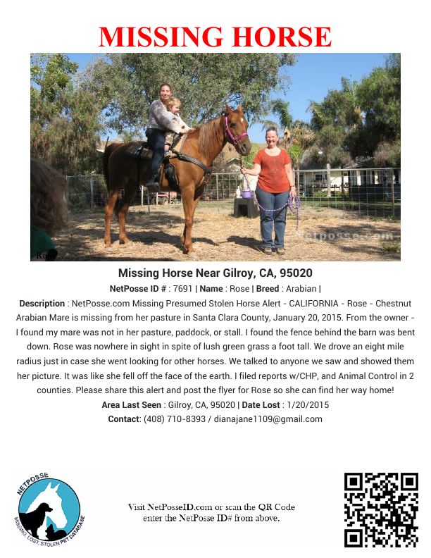 Description: NetPosse.com Missing Presumed Stolen Horse Alert - CALIFORNIA - Rose - Chestnut Arabian Mare is missing from her pasture in Santa Clara County, January 20, 2015. From the owner - I found my mare was not in her pasture, paddock, or stall. I found the fence behind the barn was bent down. Rose was nowhere in sight in spite of lush green grass a foot tall. We drove an eight mile radius just in case she went looking for other horses. We talked to anyone we saw and showed them her picture. It was like she fell off the face of the earth. I filed reports w/CHP, and Animal Control in 2 counties. Please share this alert and post the flyer for Rose so she can find her way home!