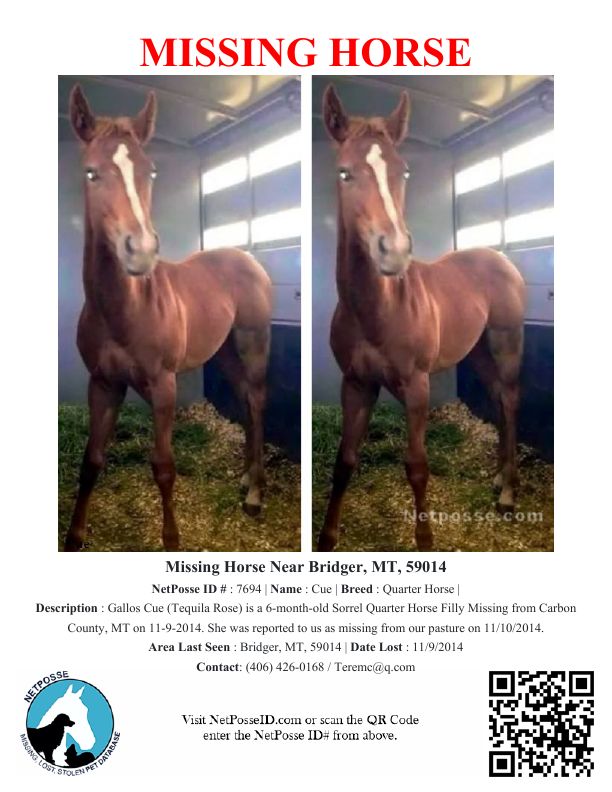 Description: Gallos Cue (Tequila Rose) is a 6-month-old Sorrel Quarter Horse Filly Missing from Carbon County, MT on 11-9-2014. She was reported to us as missing from our pasture on 11/10/2014.