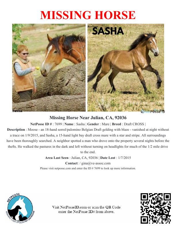 Description: NetPosse.com Missing - PRESUMED STOLEN - HORSES Alert - CALIFORNIA - Moose and Sasha disappeared within 48 hours of each other from their pasture in San Diego County, California, from a herd of 20 horses. First, Sasha - a 15-hand light bay draft cross mare with a star and stripe - disappeared without a trace at night in 1/7/2015. Next, Moose - an 18-hand sorrel/palomino Belgian Draft gelding with blaze - vanished at night without a trace on 1/9/2015.