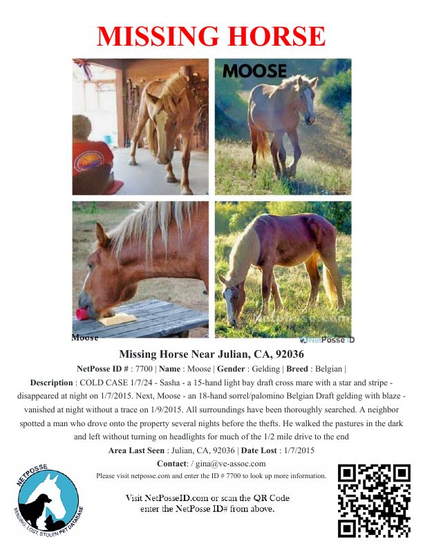 Description: NetPosse.com Missing - PRESUMED STOLEN - HORSES Alert - CALIFORNIA - Moose and Sasha disappeared within 48 hours of each other from their pasture in San Diego County, California, from a herd of 20 horses. First, Sasha - a 15-hand light bay draft cross mare with a star and stripe - disappeared without a trace at night in 1/7/2015. Next, Moose - an 18-hand sorrel/palomino Belgian Draft gelding with blaze - vanished at night without a trace on 1/9/2015.