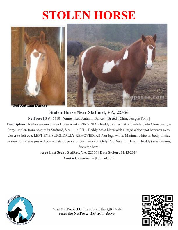 Description: NetPosse.com Stolen Horse Alert - VIRGINIA - Reddy, a chestnut and white pinto Chincoteague Pony - stolen from pasture in Stafford, VA - 11/13/14. Reddy has a blaze with a large white spot between eyes, closer to left eye. LEFT EYE SURGICALLY REMOVED. All four legs white. Minimal white on body. Inside pasture fence was pushed down, outside pasture fence was cut. Only Red Autumn Dancer (Reddy) was missing from the herd.