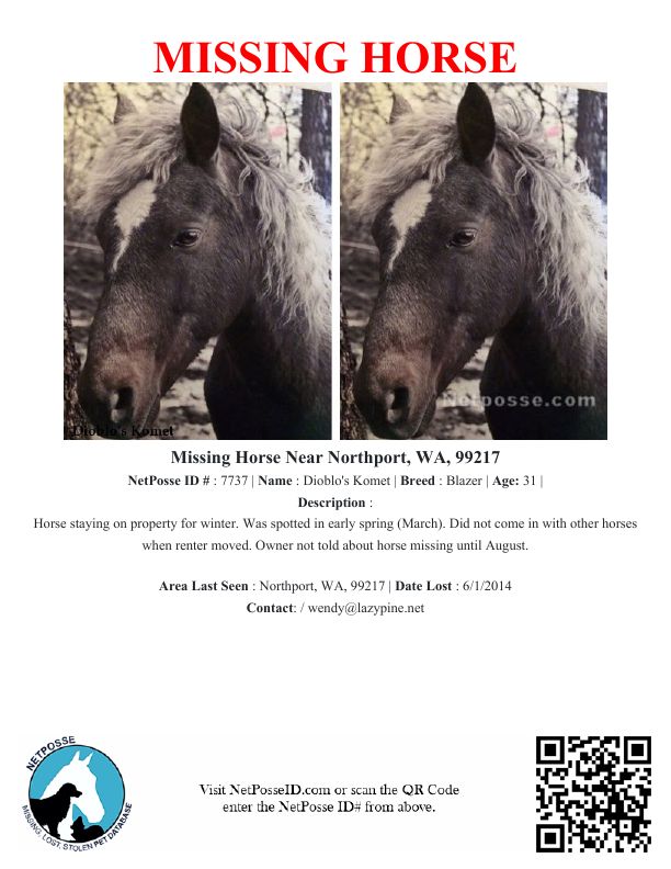 Description: Horse staying on property for winter. Was spotted in early spring (March). Did not come in with other horses when renter moved. Owner not told about horse missing until August.