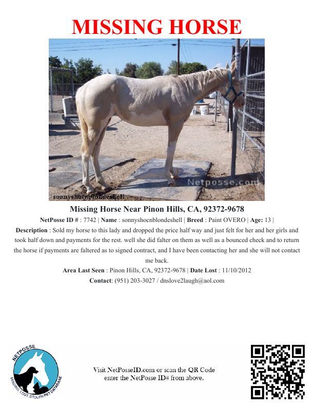 Description: Sold my horse to this lady and dropped the price half way and just felt for her and her girls and took half down and payments for the rest. well she did falter on them as well as a bounced check and to return the horse if payments are faltered as to signed contract, and I have been contacting her and she will not contact me back.