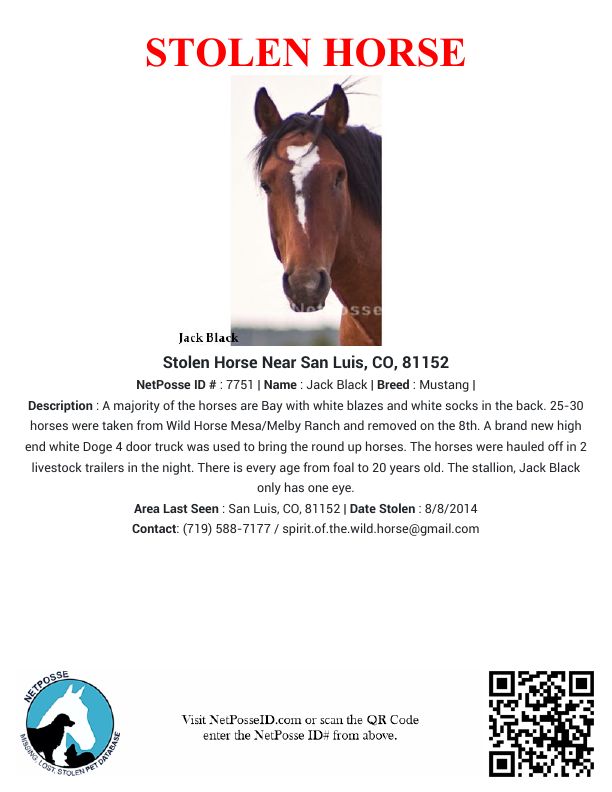 Description: A majority of the horses are Bay with white blazes and white socks in the back. 25-30 horses were taken from Wild Horse Mesa/Melby Ranch and removed on the 8th. A brand new high end white Doge 4 door truck was used to bring the round up horses. The horses were hauled off in 2 livestock trailers in the night. There is every age from foal to 20 years old. The stallion, Jack Black only has one eye.