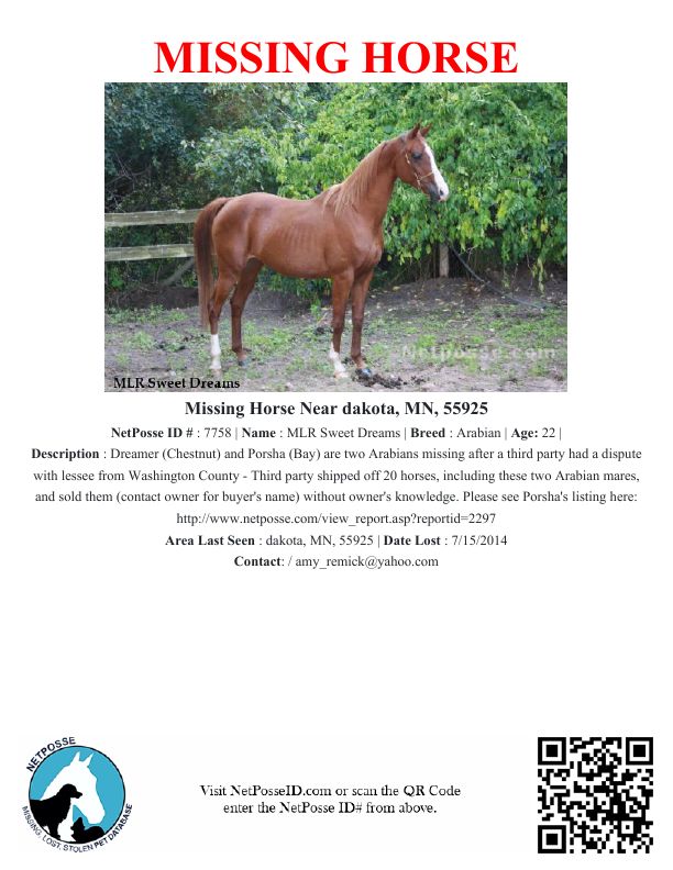Description: Dreamer (Chestnut) and Porsha (Bay) are two Arabians missing after a third party had a dispute with lessee from Washington County - Third party shipped off 20 horses, including these two Arabian mares, and sold them (contact owner for buyer's name) without owner's knowledge.