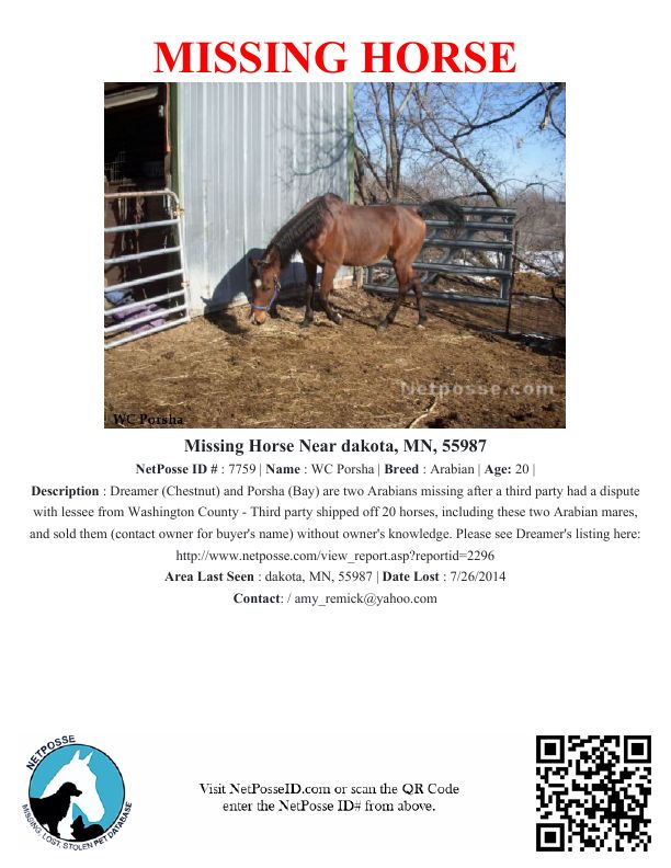 Description: Dreamer (Chestnut) and Porsha (Bay) are two Arabians missing after a third party had a dispute with lessee from Washington County - Third party shipped off 20 horses, including these two Arabian mares, and sold them (contact owner for buyer's name) without owner's knowledge.