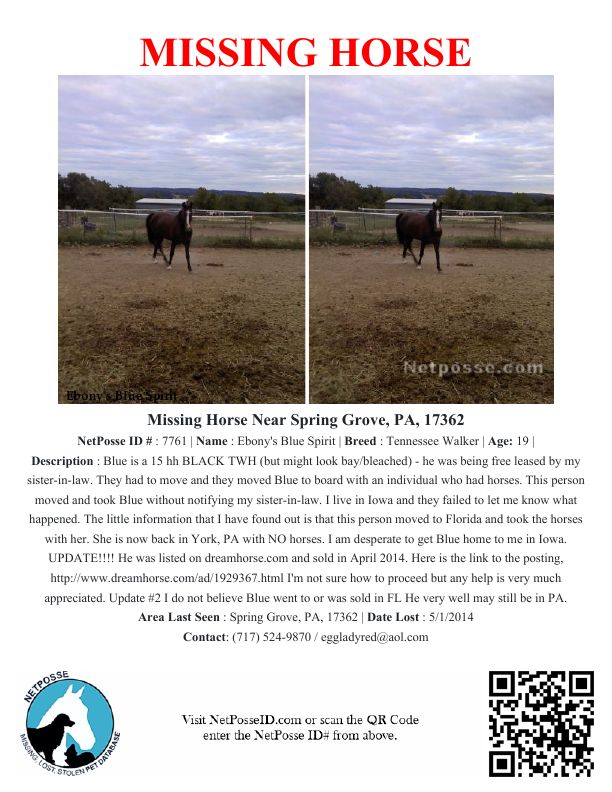Description: Blue is a 15 hh BLACK TWH (but might look bay/bleached) - he was being free leased by my sister-in-law. They had to move and they moved Blue to board with an individual who had horses. This person moved and took Blue without notifying my sister-in-law. I live in Iowa and they failed to let me know what happened. The little information that I have found out is that this person moved to Florida and took the horses with her. She is now back in York, PA with NO horses. I am desperate to get Blue home to me in Iowa.