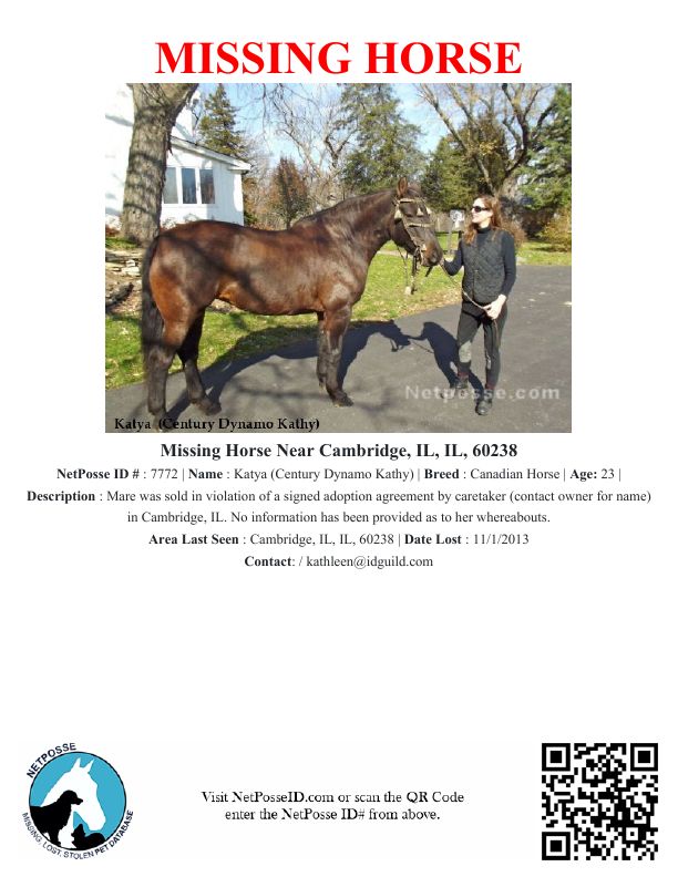Description: Mare was sold in violation of a signed adoption agreement by caretaker (contact owner for name) in Cambridge, IL. No information has been provided as to her whereabouts.