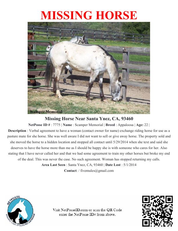 Description: Verbal agreement to have a woman (contact owner for name) exchange riding horse for use as a pasture mate for she horse. She was well aware I did not want to sell or give away horse. The property sold and she moved the horse to a hidden location and stopped all contact until 5/29/2014 when she text and said she deserves to have the horse more than me as I should be happy she is with someone who cares for her. Also stating that I have never called her and that we had some agreement to train my other horses but broke my end of the deal. This was never the case. No such agreement. Woman has stopped returning my calls.