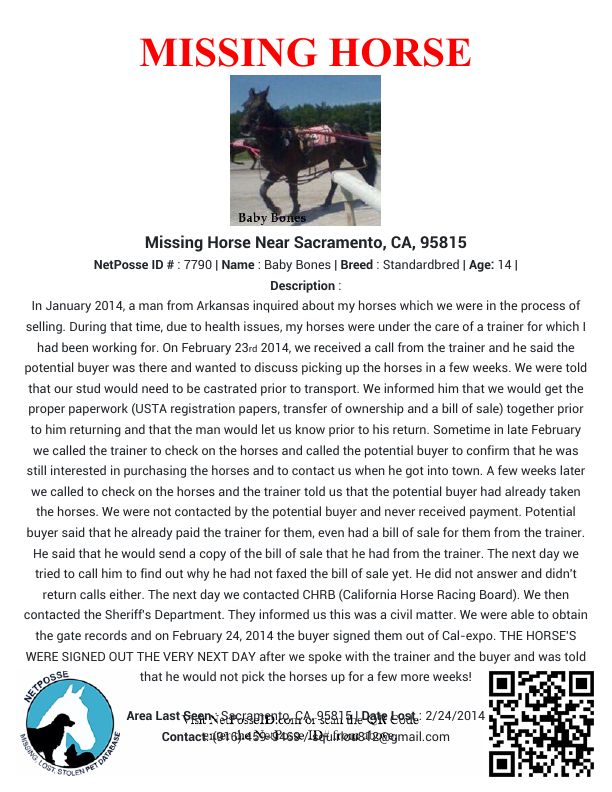 Description: In January 2014, a man from Arkansas inquired about my horses which we were in the process of selling. During that time, due to health issues, my horses were under the care of a trainer for which I had been working for. On February 23rd 2014, we received a call from the trainer and he said the potential buyer was there and wanted to discuss picking up the horses in a few weeks. We were told that our stud would need to be castrated prior to transport. We informed him that we would get the proper paperwork (USTA registration papers, transfer of ownership and a bill of sale) together prior to him returning and that the man would let us know prior to his return. Sometime in late February we called the trainer to check on the horses and called the potential buyer to confirm that he was still interested in purchasing the horses and to contact us when he got into town. A few weeks later we called to check on the horses and the trainer told us that the potential buyer had already taken the horses. We were not contacted by the potential buyer and never received payment. Potential buyer said that he already paid the trainer for them, even had a bill of sale for them from the trainer. He said that he would send a copy of the bill of sale that he had from the trainer. The next day we tried to call him to find out why he had not faxed the bill of sale yet. He did not answer and didn't return calls either. The next day we contacted CHRB (California Horse Racing Board). We then contacted the Sheriff's Department. They informed us this was a civil matter. We were able to obtain the gate records and on February 24, 2014 the buyer signed them out of Cal-expo. THE HORSE'S WERE SIGNED OUT THE VERY NEXT DAY after we spoke with the trainer and the buyer and was told that he would not pick the horses up for a few more weeks!