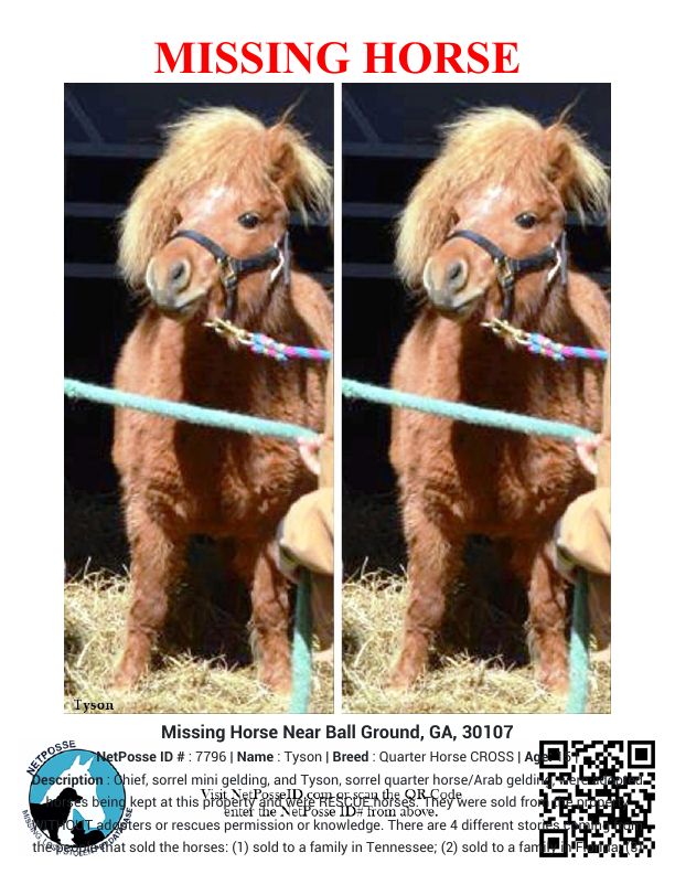 Description: Chief, sorrel mini gelding, and Tyson, sorrel quarter horse/Arab gelding, were adopted horses being kept at this property and were RESCUE horses. They were sold from the property WITHOUT adopters or rescues permission or knowledge. There are 4 different stories coming from the people that sold the horses: (1) sold to a family in Tennessee; (2) sold to a family in Florida; (3) sold at Cartersville Auction; (4) sold at Cleveland Tennessee Auction. The crime has been reported to Cherokee Sheriff's Office and is under investigation. Also charges being filed against the family for theft. (NetPosse currently listed as Missing-Civil, pending Criminal Report from Law Enforcement).