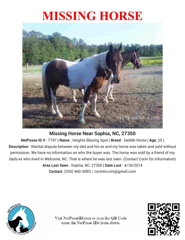 Description: Marital dispute between my dad and his ex and my horse was taken and sold without permission. We have no information on who the buyer was. The horse was sold by a friend of my dads ex who lived in Welcome, NC. That is where he was last seen. (Contact Corin for information)