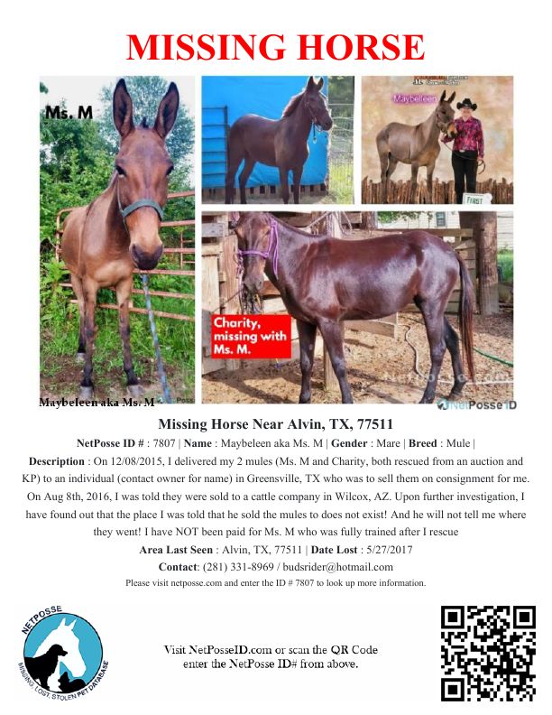 Description: On 12/08/2015, I delivered my 2 mules (Ms. M and Charity, both rescued from an auction and KP) to an individual (contact owner for name) in Greensville, TX who was to sell them on consignment for me. On Aug 8th, 2016, I was told they were sold to a cattle company in Wilcox, AZ. Upon further investigation, I have found out that the place I was told that he sold the mules to does not exist! And he will not tell me where they went! I have NOT been paid for Ms. M who was fully trained after I rescued her. I was given a saddle in trade for Charity. I want to know where my mules went! Please help me find Ms. M and Charity.