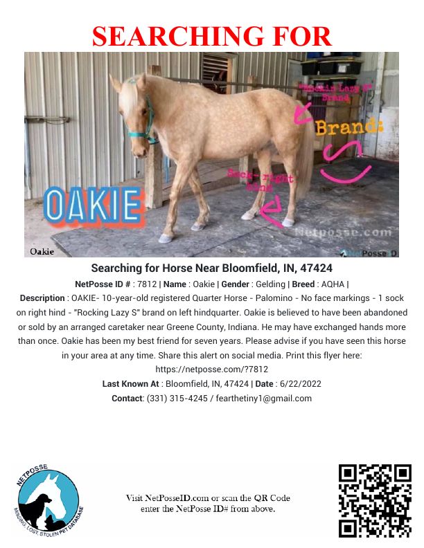 Oakie is believed to have been sold or "rescued" from Southern Indiana. At some point, it was noted by the Sheriff that this separate individual claimed that Oakie could be in Texas. Other than that, someone out there knows where he might be!