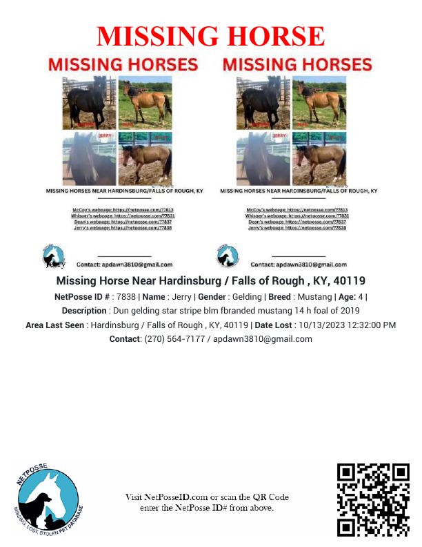 Description: Jerry went missing with 3 other mustangs he was being fostered by a young woman for a rescue.
